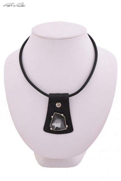 1617-es cikkszámú Cango&Rinaldi nyaklánc lakk fekete és fekete színű mintás (fekete broken glass) minőségi bőr kombinációjából. A nyaklánc közepén egy nikkel színű fém foglalatban egy darab különleges csiszolású és formájú Black Diamond kristály található. A nyaklánc méretei: 410 mm hosszú, 5 mm széles, mely mágneses hengerzárral kapcsolható, medál hossza: 65 mm. A nyaklánc nikkel színű fém kiegészítőkkel készült, ahol a foglalat C&R feirattal és márkajelzett szegeccsel ellátott, jelezve ezzel a brand eredetiségét és minőségét.