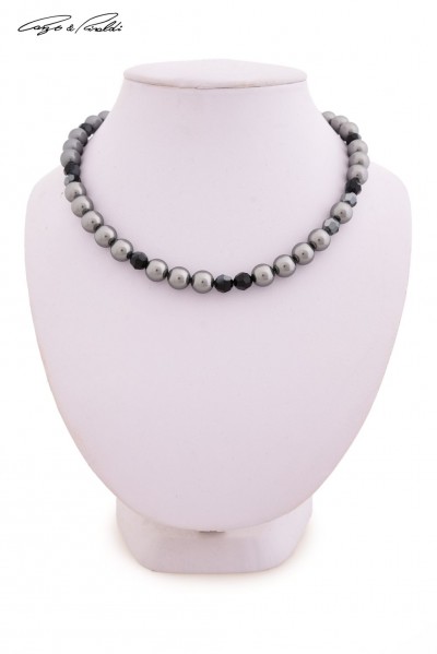 1675-ös cikkszámú Cango&Rinaldi gyöngy nyaklánc modell. Szürke (Dark Grey) színű gyöngy és fekete színű kristály konbinációjából készült egy soros Cango&Rinaldi nyaklánc, nikkel színű fém kellékkel, és mágnes zárral.