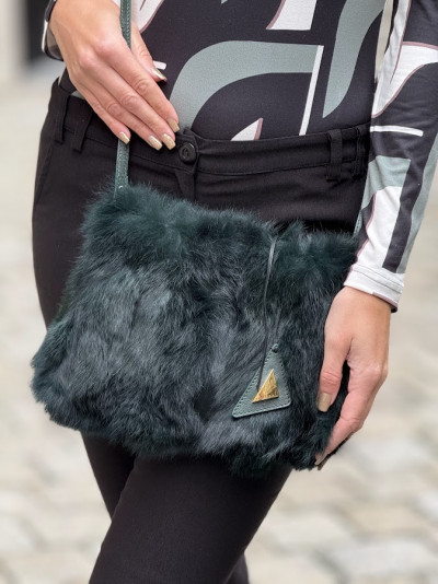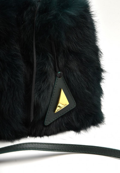 Cango&Rinaldi smaragd zöld színű minőségi olasz bőrből és valódi szőrméből készült kis méretű táska. Mágneses záródással, belseje egyterű, fix pánttal, elején arany színű márkajelzett fém kellékkel ellátott függődísszel.