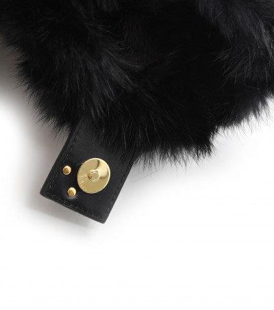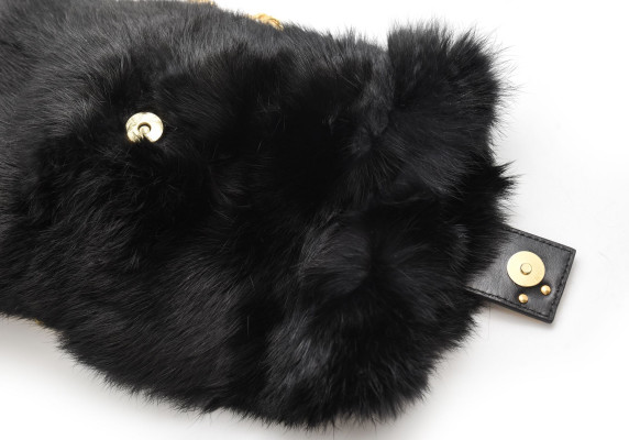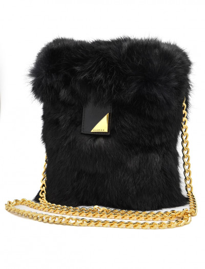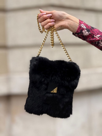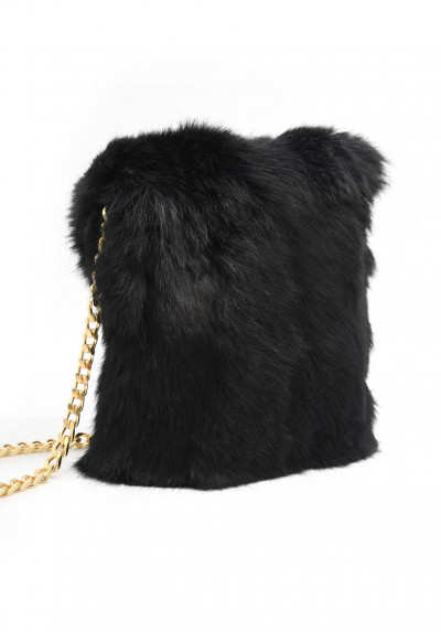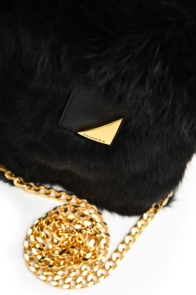 Cango&Rinaldi fekete színű minőségi olasz bőrből és valódi szőrméből készült kis méretű táska. Mágneses záródással, belseje egyterű, arany színű fix láncos pánttal, elején arany színű márkajelzett fém kellékkel díszítve.
