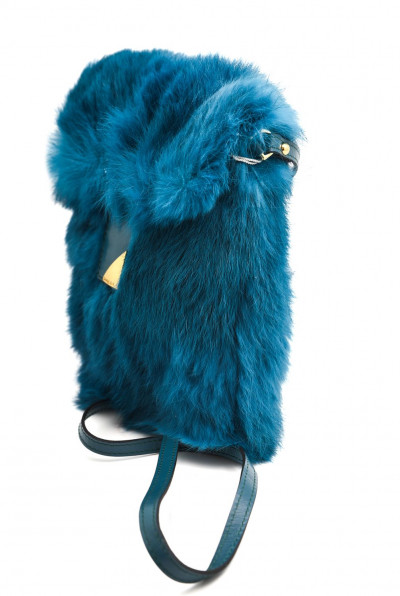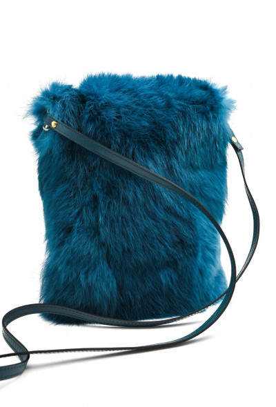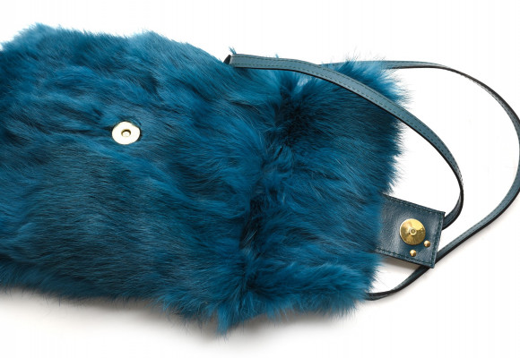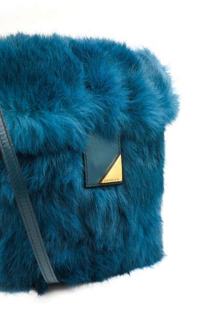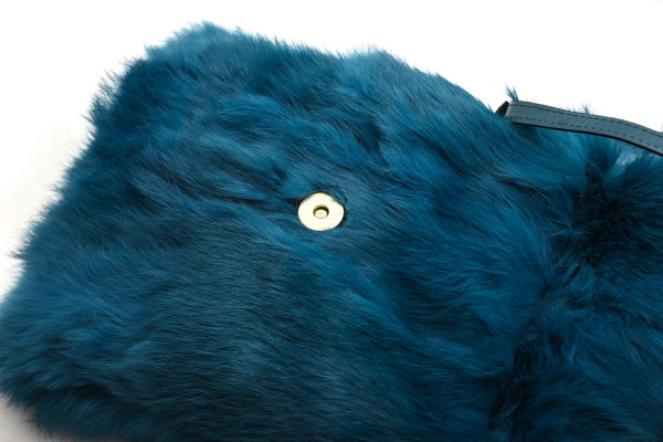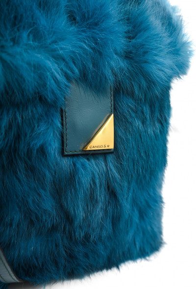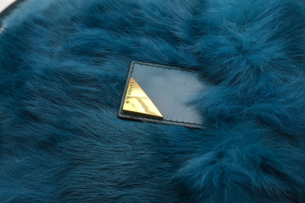 Cango&Rinaldi olajkék színű minőségi olasz bőrből és valódi szőrméből készült kis méretű táska. Mágneses záródással, belseje egyterű, fix pánttal, elején arany színű márkajelzett fém kellékkel díszítve.
