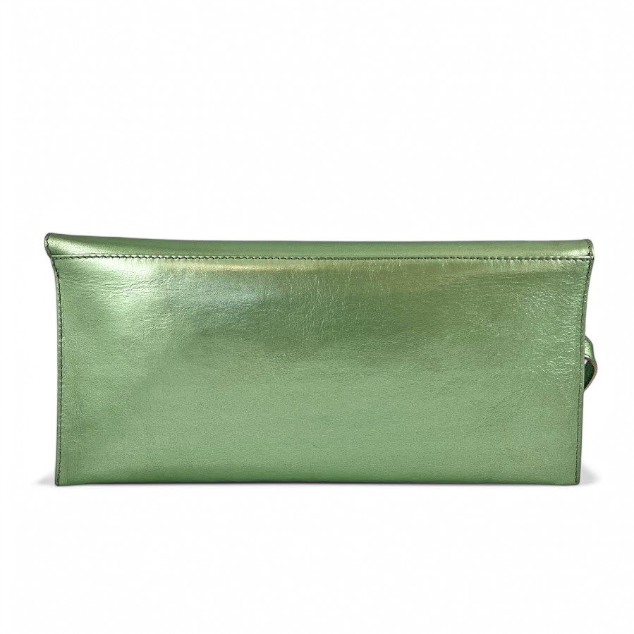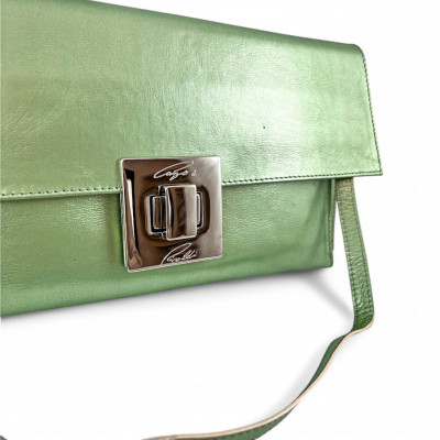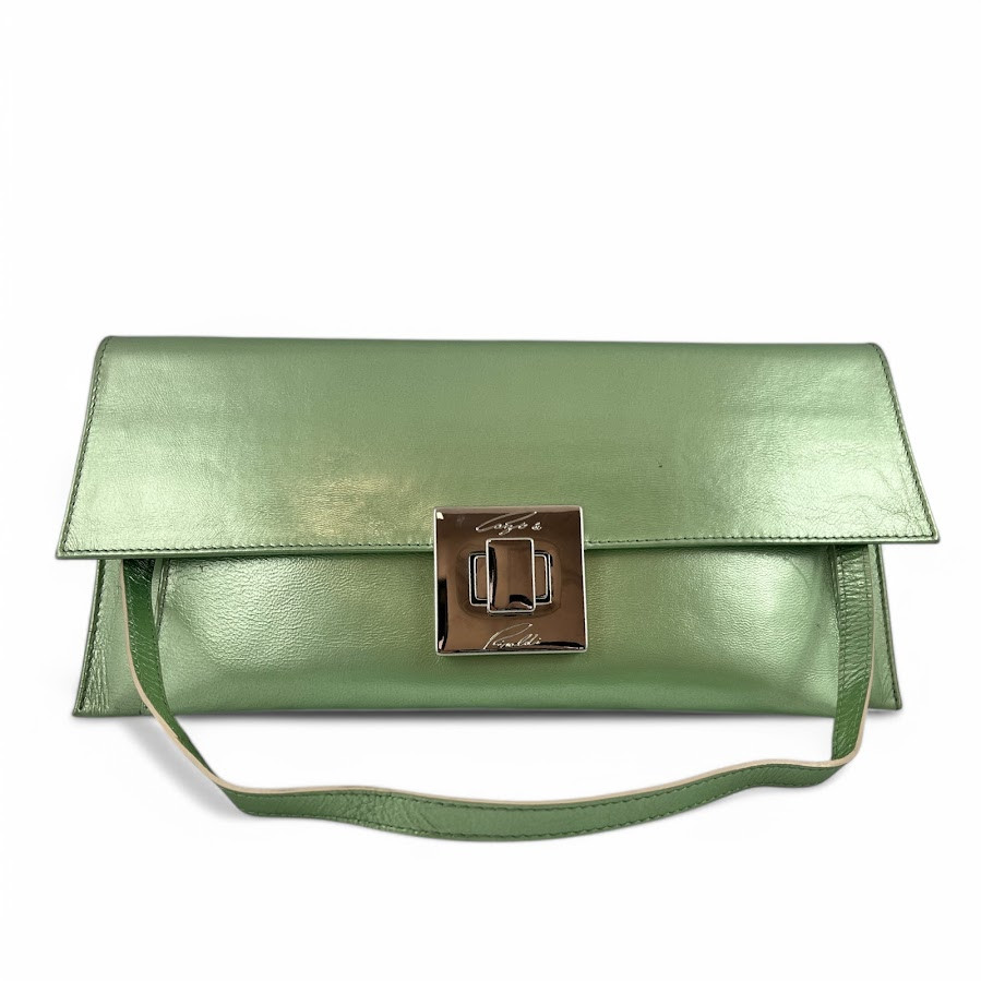 Cango&Rinaldi minőségi olasz bőrből készült táska selyemfényű pisztácia színben, csatos záródással, levehető pánttal. Márkajelzett textillel bélelt két terű belsejében egy cipzáras zsebbel, elején márkajelzett fém kellékkel.