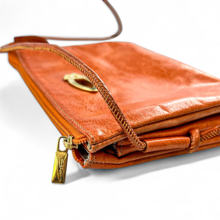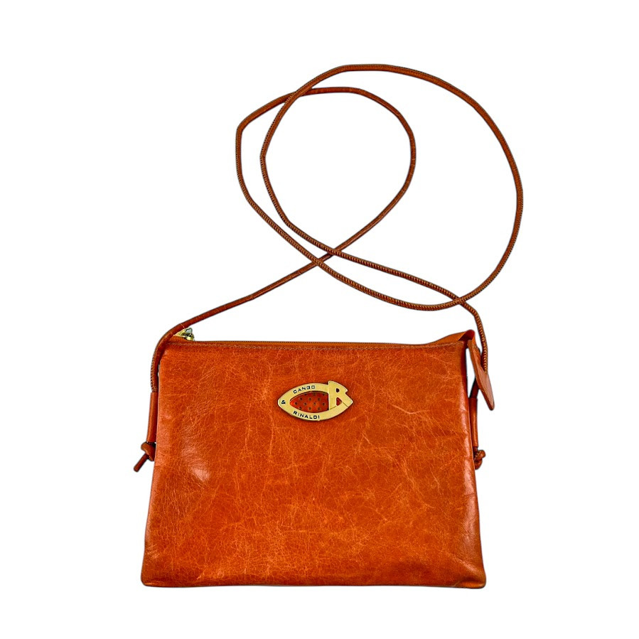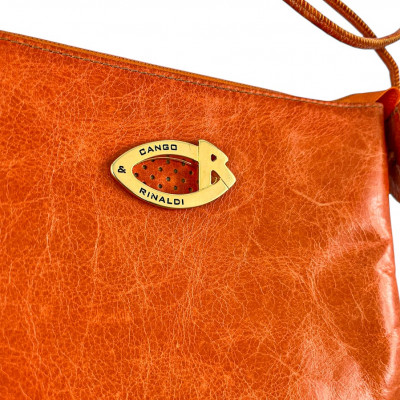 Cango&Rinaldi minőségi olasz bőrből készült váll- és oldaltáska narancssárga színben, márkajelzett textillel bélelt háromterű belsejében, további egy cipzáros zseb található, cipzáros záródással, elején márkajelzett fém táblával.