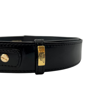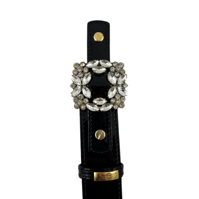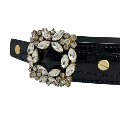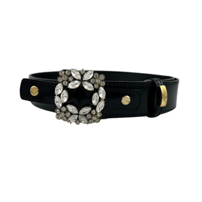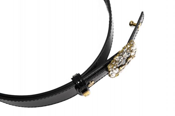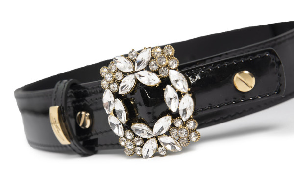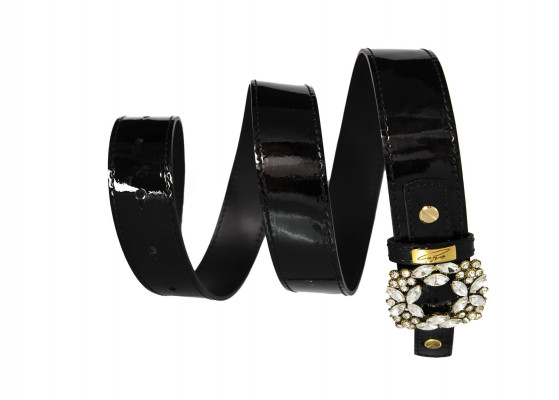 Cango&Rinaldi lakk fekete színű olasz bőrből készült női öv. Arany színű fém csatja fehér színű Swarovski kristályokkal díszített, valamint övbújtatóján Cango felirattal ellátott arany színű fém kellék jelöli a brand eredetiséget és minőséget.