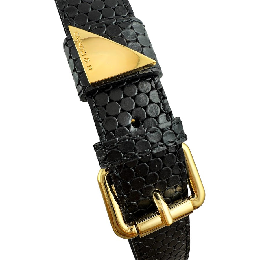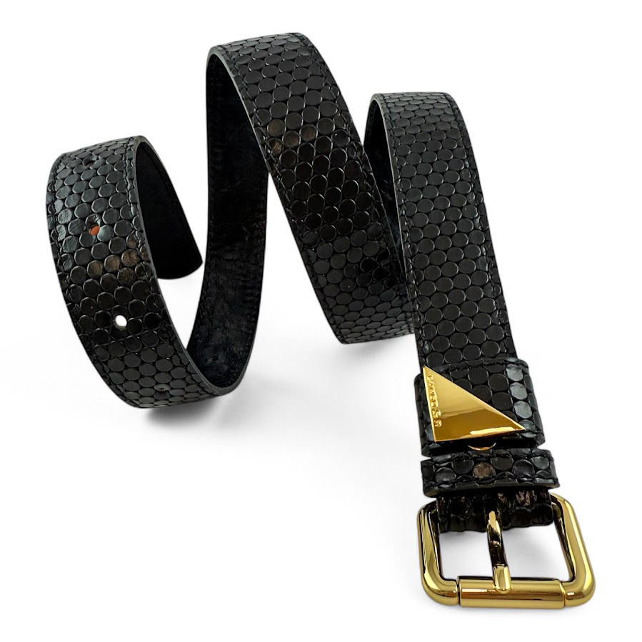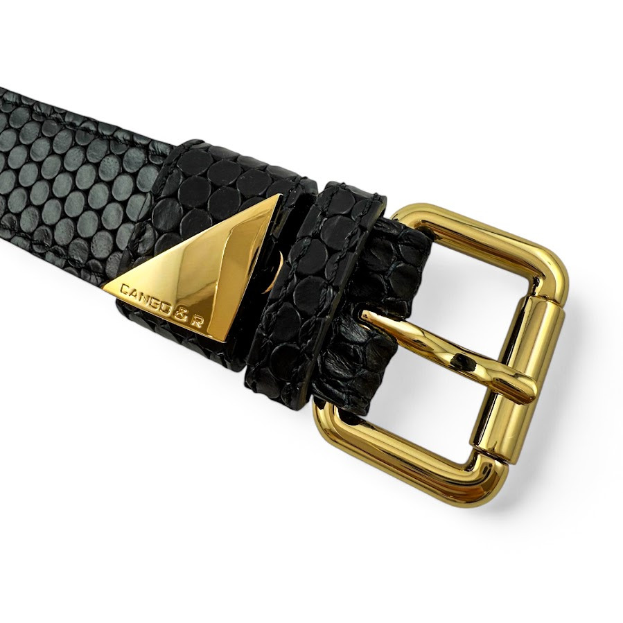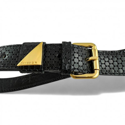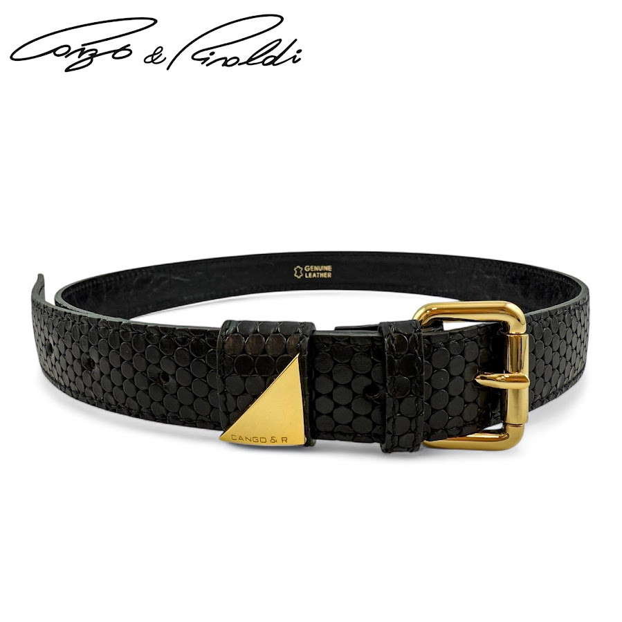 Cango&Rinaldi fekete színű minőségi olasz pong bőrből készült öv. Övbújtatóján márkajelzett fém kellékkel díszítve, arany színű fém csattal.