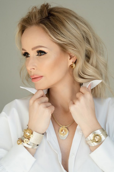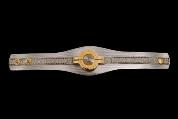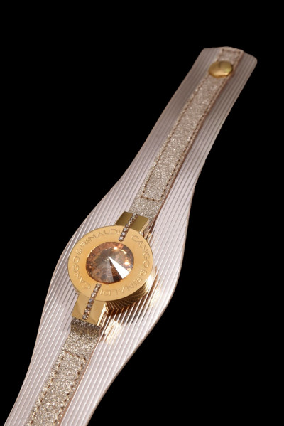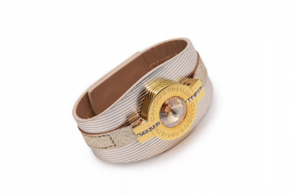 B5K cikkszámmal ellátott karkötő csíkos mintás arany és csillogós arany bőr kombinációjából, patentos záródással, közepén arany színű fém foglalattal, benne egy nagyobb méretű, különleges csiszolású, arany színű kristállyal, mellette két sorban apró, arany színű köves díszítéssel. A fémkellékbe gravírozott Cango&Rinaldi márkafelirat jelöli a brand eredetiségét és minőségét!