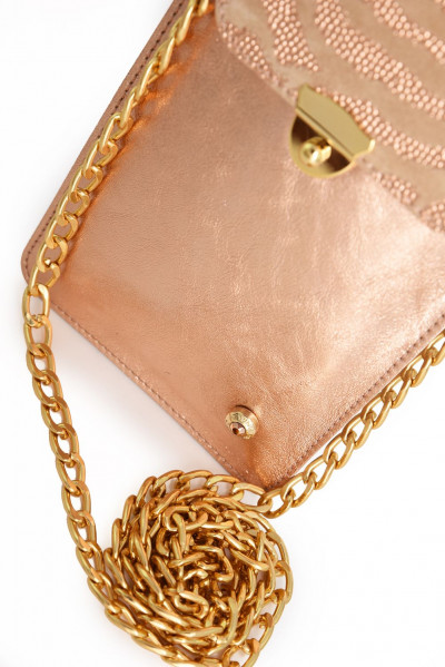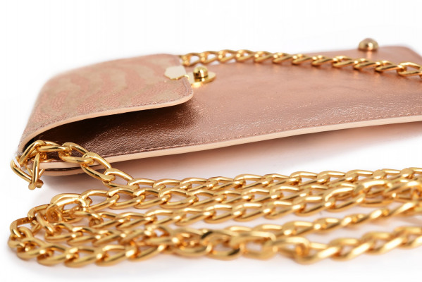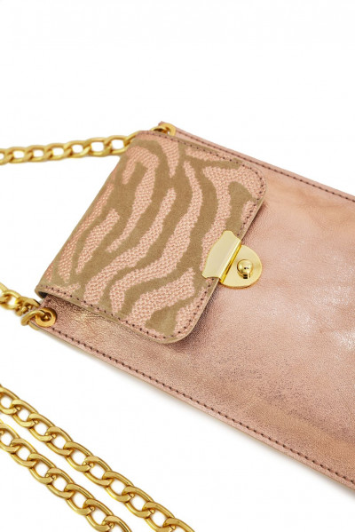 Cango&Rinaldi kézi készítésű, kisméretű (Phone) oldaltáska (telefontartó), rosegold szanben, zebra mintával, minőségi olasz bőrből; csatos záródással; arany színű fém kiegészítőkkel; elején rosegold színű swarovski kristállyal díszített, mely Cango&Rinaldi gravírozással ellátott, jelölve ezzel a brand eredetiségét és minőségét!!