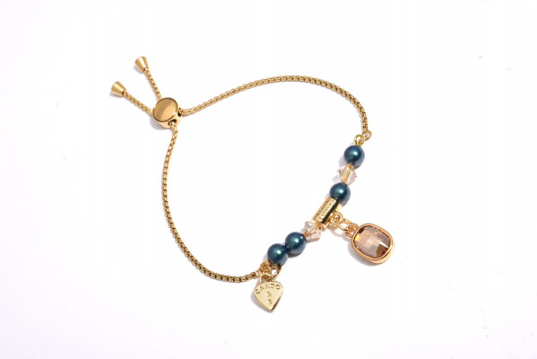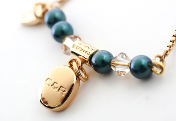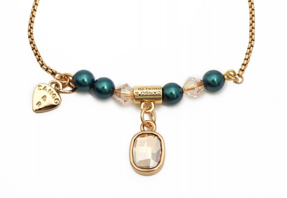 PR2203K cikkszámú Cango&Rinaldi karkötő modell a ~Pearl kollekcióból~; gyöngyházfényű skarabeuszzöld színű gyöngy, arany színű fém és arany színű kristályok kombinációjából; egy soros fazonban; közepén fém foglalatban különleges csiszolású, arany színű kristályos díszítéssel; a sor végén charm-mal. A fém kellékekbe gravírozott Cango felirat jelöli a brand eredetiségét és minőségét!