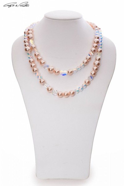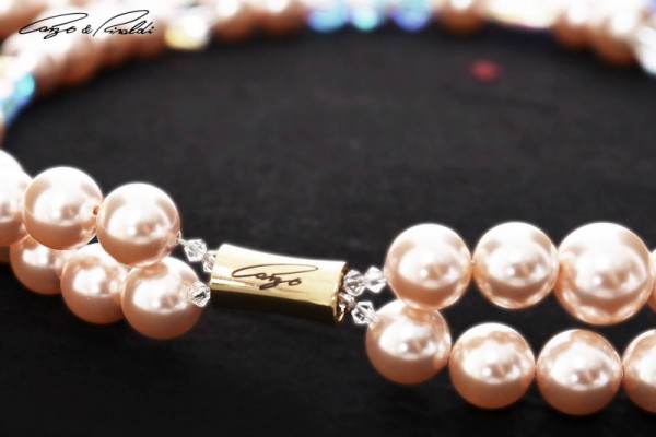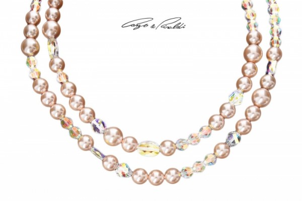 1677-es cikkszámú Cango&Rinaldi gyöngy dupla soros nyaklánc modell. Barack (Peach) színű gyöngy és színváltós (AB) színű kristály konbinációjából készült dupla soros Cango&Rinaldi nyaklánc, arany színű fém kellékkel, és mágnes zárral.
