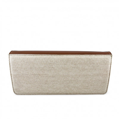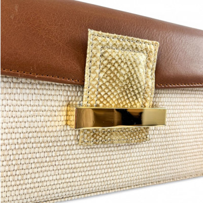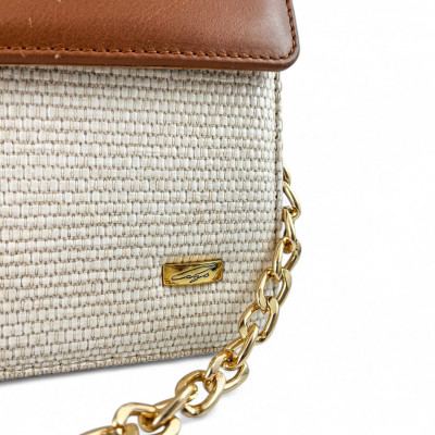 Cango&Rinaldi minőségi olasz bőrből készült láncos válltáska bézs, barna és arany színösszeállításban, márkajelzett textillel bélelt háromterű belseje patenttal záródik, arany színű fémkellékekkel, elején márkajelzett fém táblával.