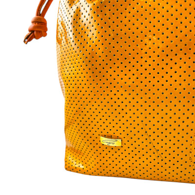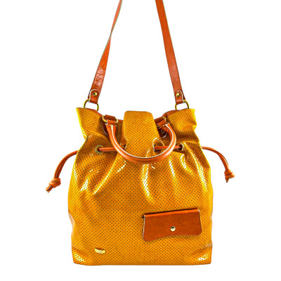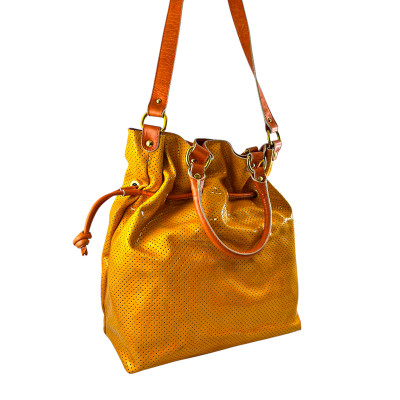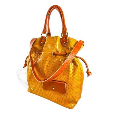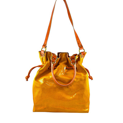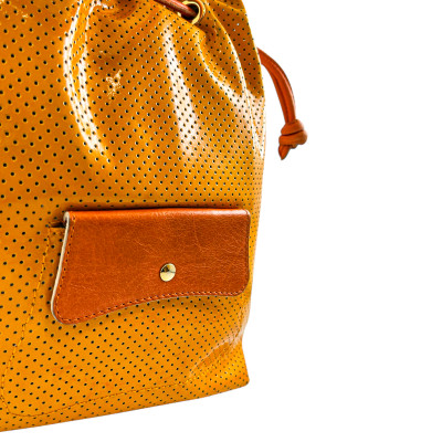Cango&Rinaldi minőségi olasz lakk bőrből készült kézi- és válltáska, narancssárga színben, patentos záródással, egyterű belsejében több rekesszel és cipzáras zsebbel, arany színű fémkellékekkel, elején fém márkajelzéssel.