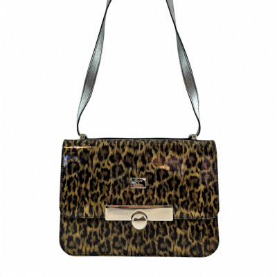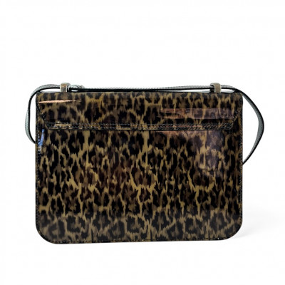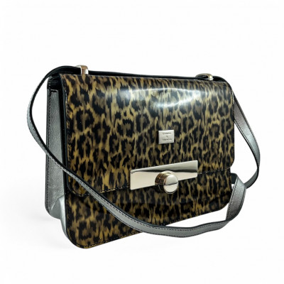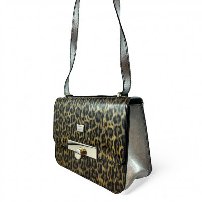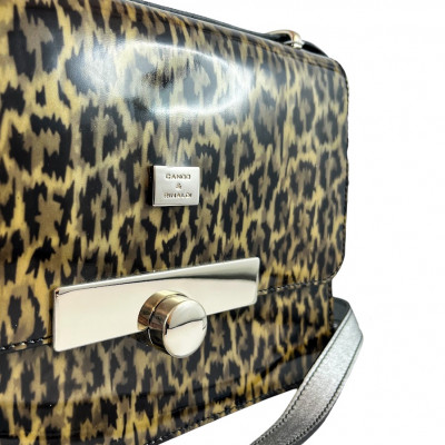 Cango&Rinaldi minőségi olasz lakk bőrből készült táska párduc mintával, ezüst színű részletekkel, csatos záródással, állítható pánttal. Márkajelzett textillel bélelt egy terű belsejében egy zsebbel, elején márkafelirattal ellátott fém kellékkel.