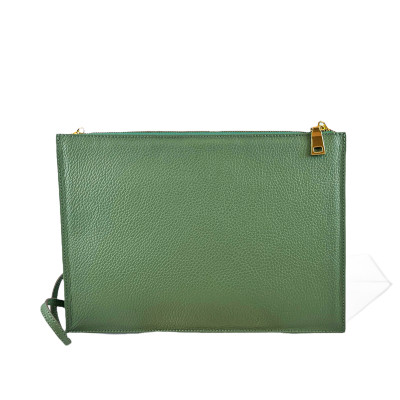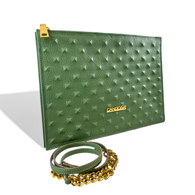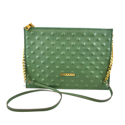 Cango&Rinaldi minőségi olasz bőrből készült táska bambuszzöld színben, anyagában dombor nyomott mintával, cipzáras záródással, levehető pánttal. Márkajelzett textillel bélelt egy terű belsejében egy cipzáras zsebbel, elején márkafelirattal ellátott fém kellékkel.
