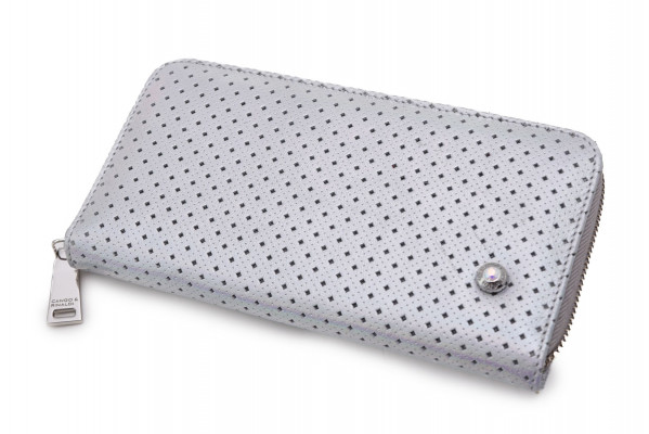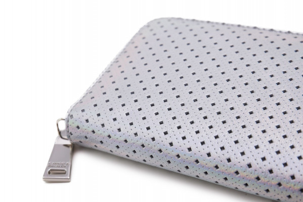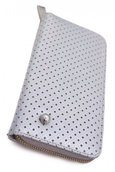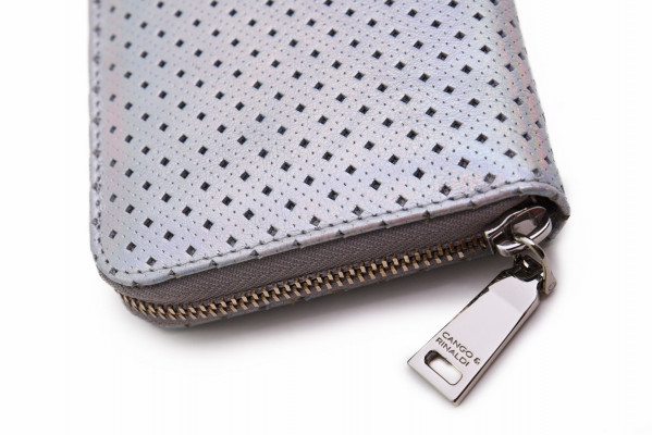 6029-es cikkszámú Cango&Rinaldi pénztárca minőségi olasz bőr alapanyagból; hologrammos ezüst színben; áttört mintázattal; ezüst színű fémkiegészítőkkel; zipzáros záródással; kétterű belsőrésszel; belül egy zipzáros rekesszel; kártyatartóval; külsején egy kisméretű szegeccsel; hologrammos színű kristályos díszítéssel; Cango&Rinaldi gravírozásokkal; jelölve ezzel a brand eredetiségét és minőségét!