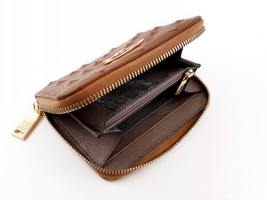6045-ös cikkszámú Cango&Rinaldi pénztárca couio barna színű 3D-s szegecs hatású mintás minőségi olasz bőrből, arany színű kiegészítőkkel, kétterű belsőrésszel, egy cipzáros rekesszel és több kártyatartóval.