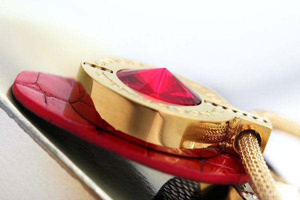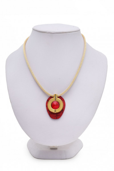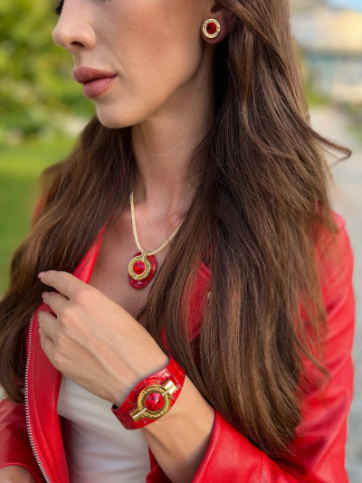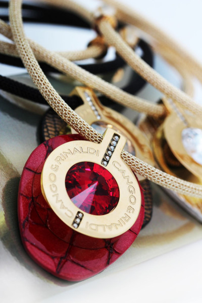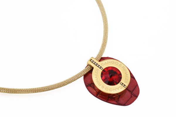 B7NY cikkszámmal ellátott nyaklánc piros spritz színű, minőségi olasz bőr és arany színű huzal kombinációjából, mágneses záródással, arany színű fém foglalatban különleges csiszolású piros színű- és két sorban apró arany színű kristály díszítéssel. A fémkellékekbe gravírozott Cango&Rinaldi márkafelirat jelöli a brand eredetiségét és minőségét!