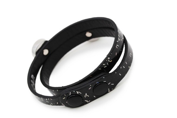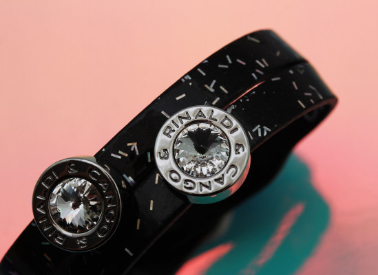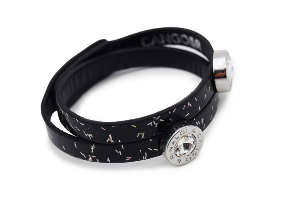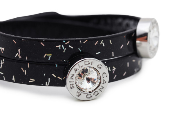B8K cikkszámmal ellátott duplasoros karkötő minőségi olasz lakkbőrből fekete színben, hologramos ezüst mintával, patentos záródással, nikkel színű fémfoglalatokkal, benne különleges csiszolású, fehér színű kristályos díszítéssel. A fémkellékekbe gravírozott Cango&Rinaldi márkafelirat jelöli a brand eredetiségét és minőségét!