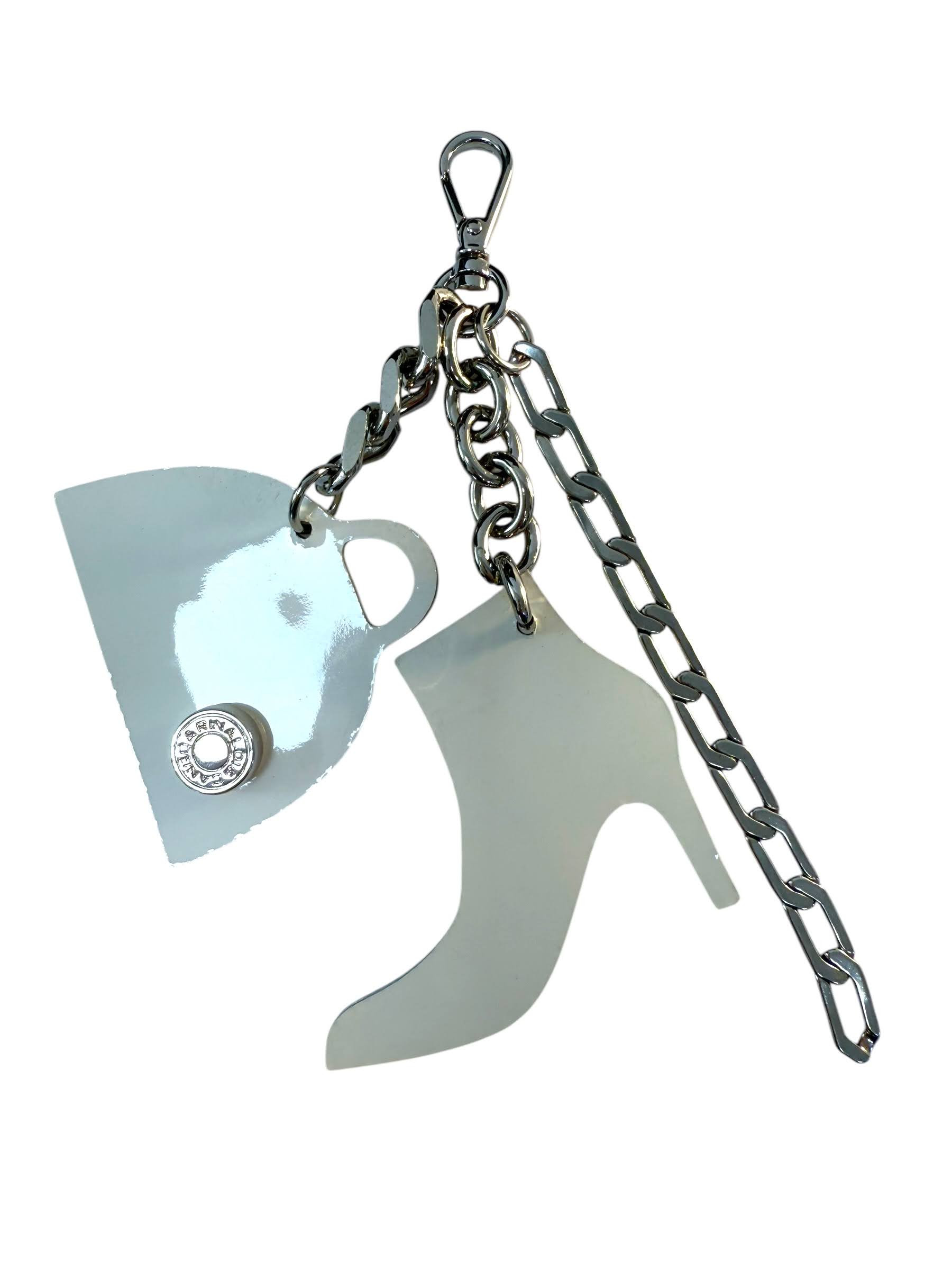 Cango&Rinaldi táskadísz, amely könnyedén rácsatolható bármely táskára, nikkel színű láncon, lakk ekrü és fehér színű kézitáska, valamint fehér és lakk ekrü színű bokacsizma formájú minőségi olasz bőr díszítéssel. A fémkelléken található Cango&Rinaldi gravírozás jelöli a brand eredetiséget és minőséget.