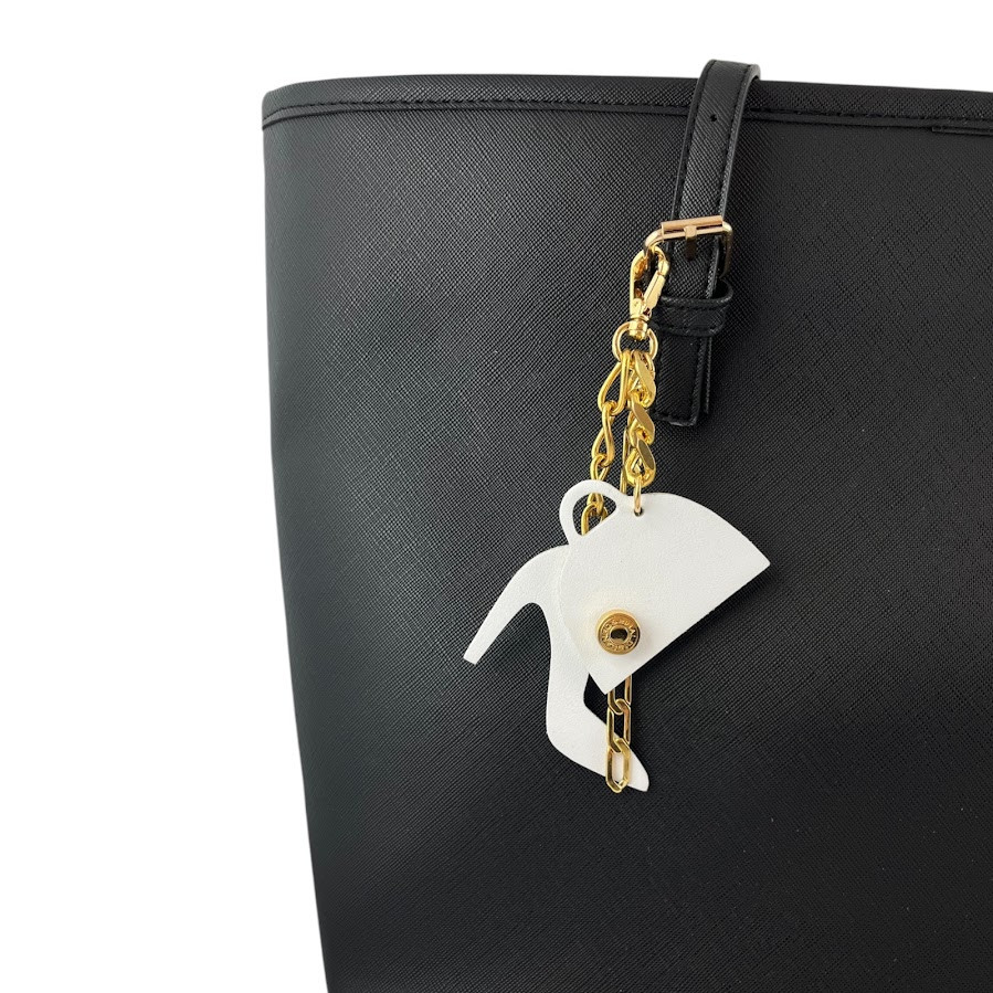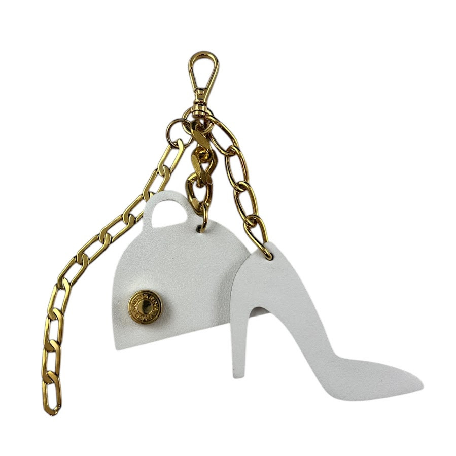 Cango&Rinaldi táskadísz, amely könnyedén rácsatolható bármely táskára, arany színű láncon, fehér és lakk ekrü színű kézitáska, valamint fehér és lakk ekrü színű cipő formájú minőségi olasz bőr díszítéssel. A fémkelléken található Cango&Rinaldi gravírozás jelöli a brand eredetiséget és minőséget.