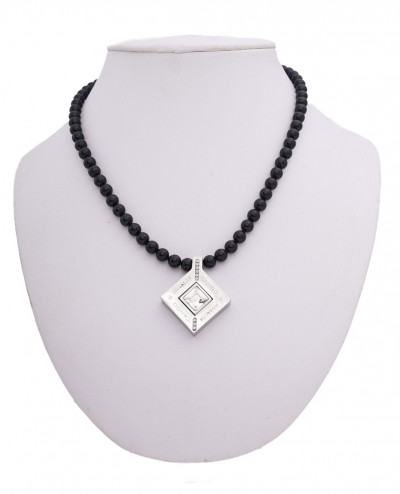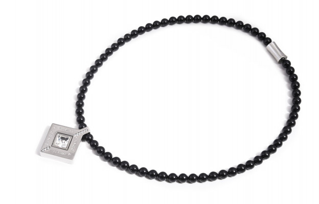 Cango&Rinaldi - Mozaik kollekciójában található nyaklánc fekete színű gyöngy és nikkel színű fémkellék kombinációjából; mágneses záródással; a fémkellékekbe fehér színű köves díszítéssel és gravírozott márkajelzéssel; mely jelöli a brand eredetiségét és minőségét!