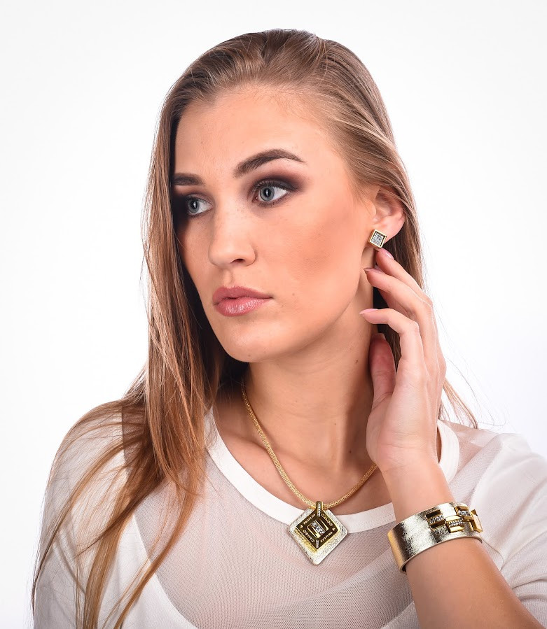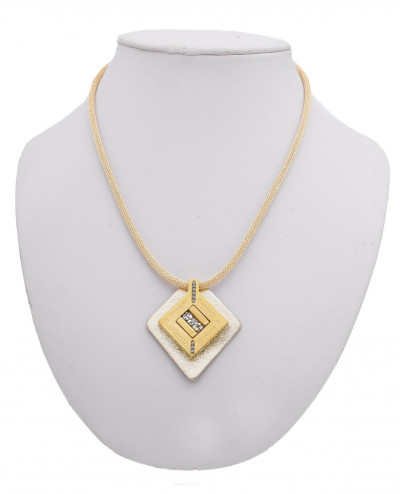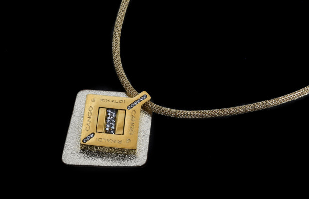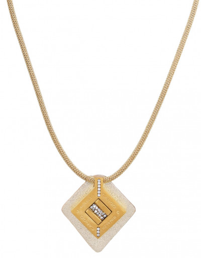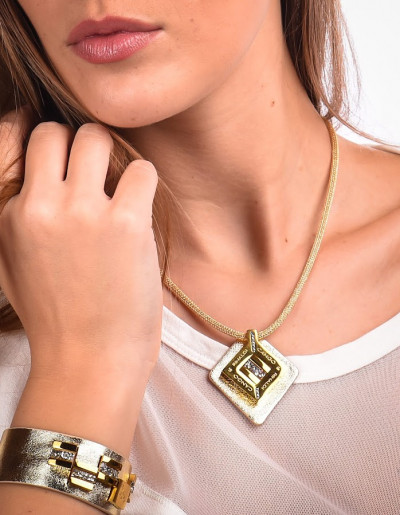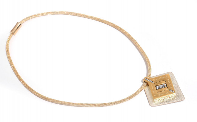 *Cango&Rinaldi - Mozaik kollekciójában található nyaklánc egy arany színű huzalon található arany színű minőségi olasz bőrön fehér színű Crystal Rock kövezéssel és Cango&Rinaldi gravírozással ellátott arany színű fémkellék található, a gravírozás jelöli brand eredetiségét és minőségét.
