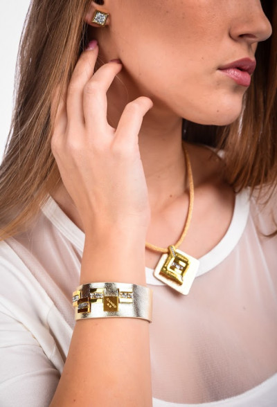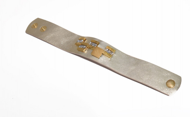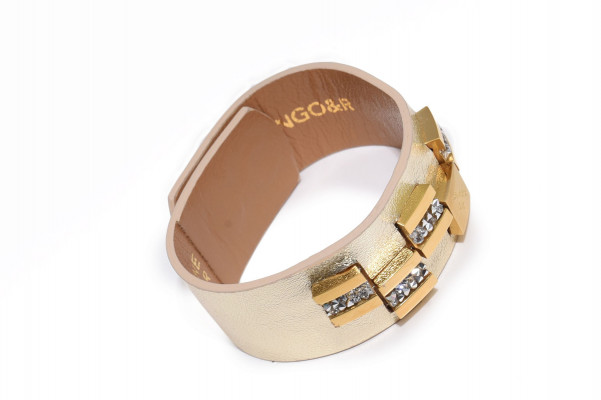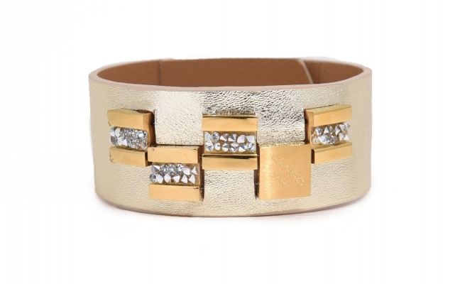 *Cango&Rinaldi - Mozaik kollekciójában található arany színű minőségi olasz bőrből készült karkötőt, fehér színű Crystal Rock kövezéssel és Cango&R gravírozással ellátott arany színű fémkellékek díszítik. A karkötő patentokkal zárható, a gravírozás és a belső felébe nyomott Cango&R felirat jelöli brand eredetiségét és minőségét.