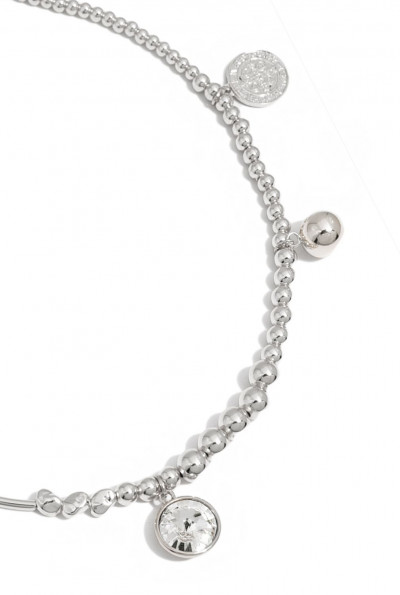 Cango&Rinaldi nyaklánc a ─ Peace&Love ─ kollekcióból; különböző méretű ezüst színű gyöngyök kombinációjából; egysoros fazonban; eltérő formájú és nagyságú ezüst színű charmokkal díszítve.