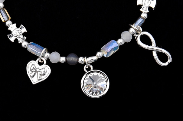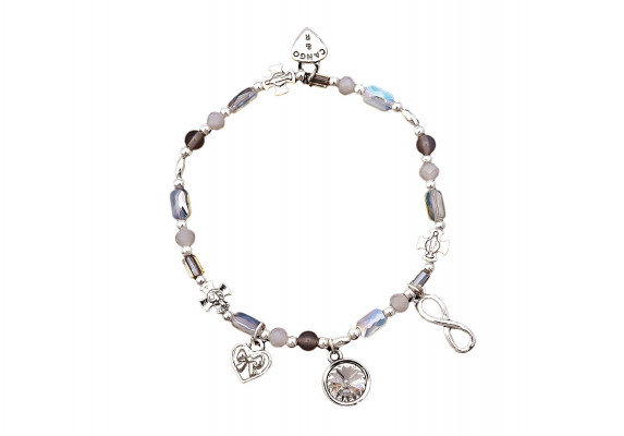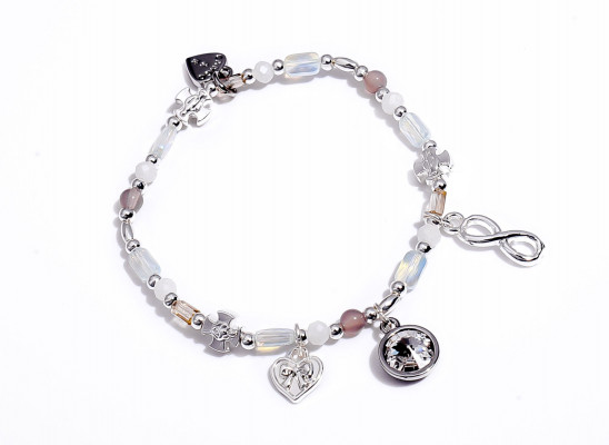 Cango&Rinaldi karkötő a ─ Peace&Love ─ kollekcióból; különleges csiszolású és különböző méretű tejfehér, opál fehér és ezüst színű gyöngyök kombinációjából; egysoros fazonban; eltérő formájú és nagyságú ezüst színű charmokkal díszítve.