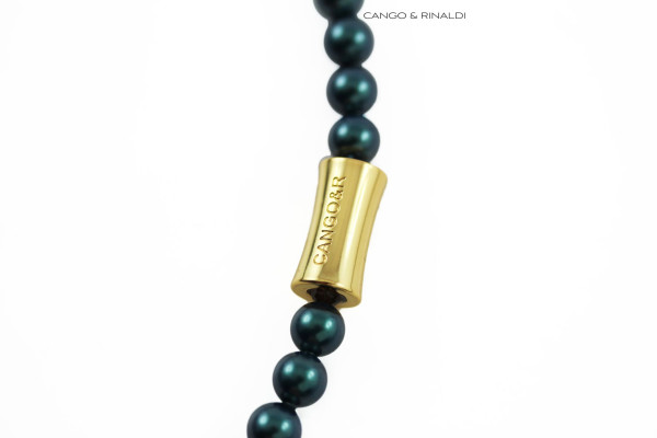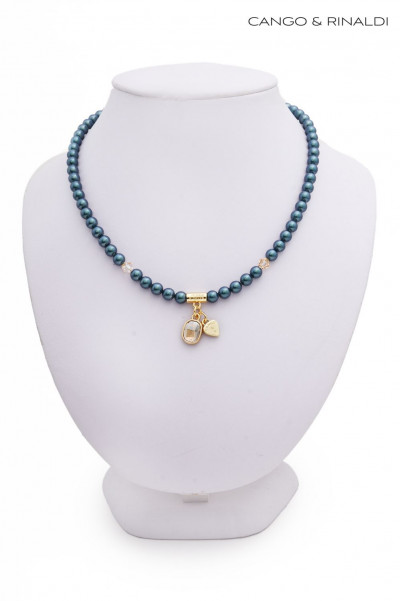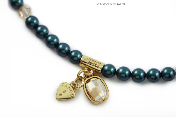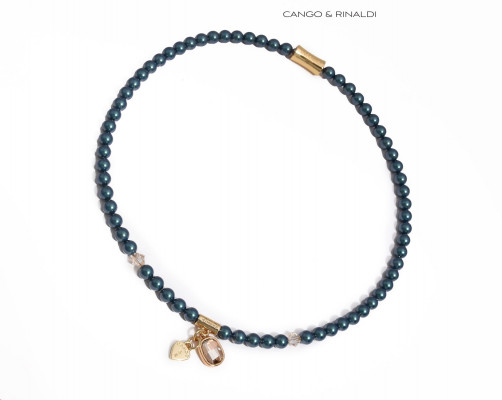 PR2202NY cikkszámú Cango&Rinaldi gyöngy nyaklánc modell a ~Pearl kollekcióból~; gyöngyházfényű skarabeuszzöld színű gyöngy és arany színű kristály kombinációjából készült egysoros fezonban; arany színű fém kellékkel; fém foglalattal; charm díszítéssel, melyben arany színű, különleges csiszolású kristály található. A fém kellékekbe gravírozott Cango&Rinaldi felirat jelöli a brand eredetiségét és minőségét.